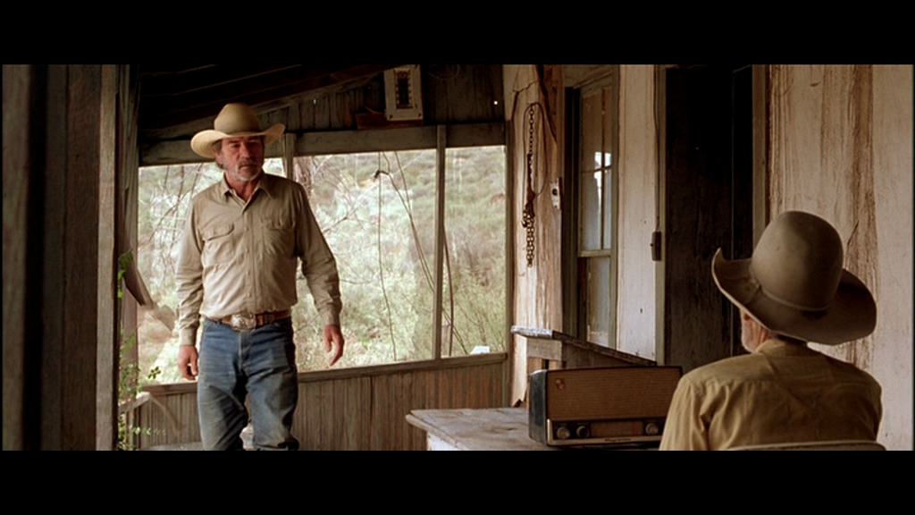 În prima, împreună cu personajul principal, dăm peste un bătrânel orb ce ascultă în pridvorul casei sale dărăpănate un post de radio mexican. Gazda pare complet absorbită de șuvoiul verbal ce răzbate din difuzoarele aparatului dat la maximum. Pe acest considerent, intrusul ce-i calcă pragul i se adresează în spaniolă. Omul e pământ de flori. Nu se învredniceşte să răspundă. Sau ezită, pentru că surprizei cauzate de apariția unei ființe omenești într-un asemenea loc off the map, i se adaugă și aceea de a i se vorbi în... spaniolă. Cu accent! Drept pentru care își drege vocea dogită şi îndeamnă oaspetele să vorbească în engleză. Spaniolă nu cunoaște. „Și-atunci - zice TLJ - de ce asculţi postul ăsta?" „Pentru că îmi place cum sună limba asta", răspunde dezarmant moșulețul.În a doua, un grup de văcari mexicani urmărește, în vârf de munte, la un televizor sport, un serial siropos american, fără să înţeleagă o (pap)iotă din limba în care își spun replicile actorii. Ar avea și altceva mai bun de făcut, desigur, că doar nu s-a lăsat noaptea, însă ritualul obligă!